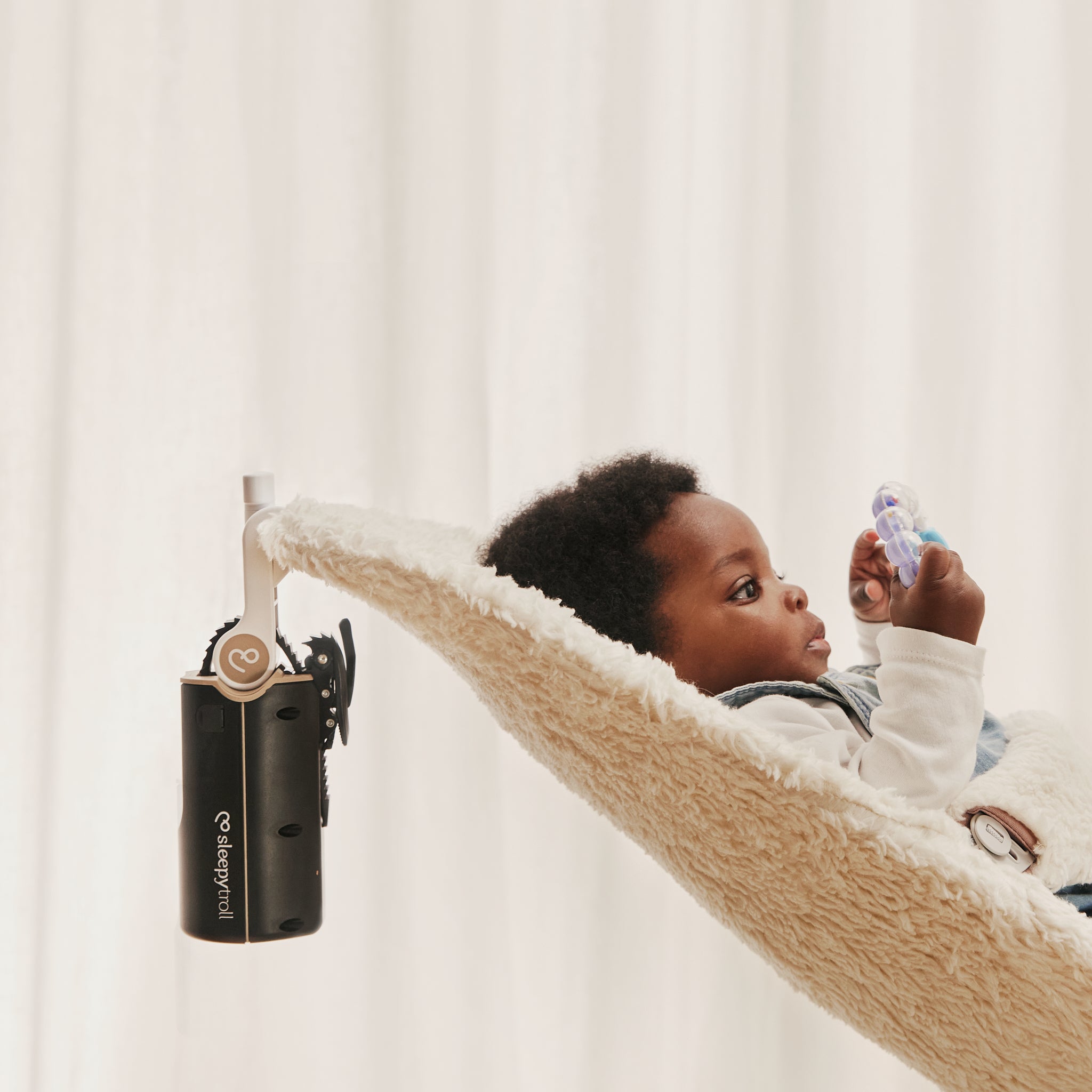Befestigen Sie den Sleepytroll am Kinderwagen, an Babywippe, Wiege oder Bett.